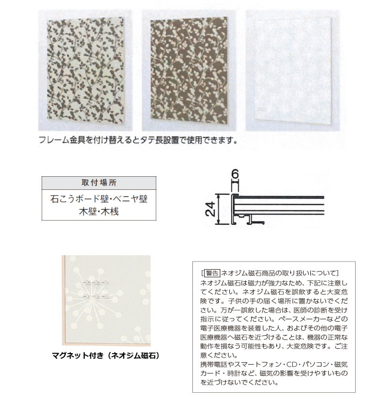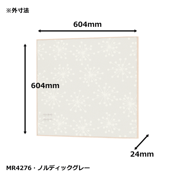 商 品 説 明 材質 本体:アルミラッピング・スチール布目シート貼り 外寸法 幅604×高さ604×奥行24mm 重量 2.6kg カラー プラントベージュ(MR4268) プラントブラウン(MR4272) ノルディックグレー (MR4276) 付属品 マグネット(M-5010)6個・壁取付金具・石こうボード用ピン・木壁用ネジ 取付場所 石こうボード壁・ベニヤ壁・木壁・木桟 特長 ●マグネット固定する掲示板で使わない時はアートパネルとしてお部屋をセンスアップ。